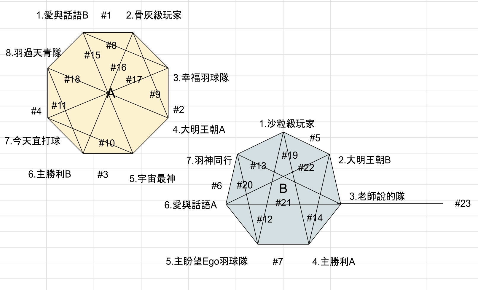 1.參賽隊伍共15隊,分為2組進行分組賽事,一個隊伍會與三組隊伍進行比賽。